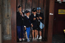 | 京都に入って「太秦映画村」に行きました。到着後すぐに昼食。メニューは「カツカレー」右の写真は「PADIOS館」の中にあった展示物で遊んでいる所です。 |